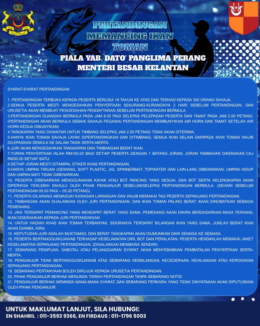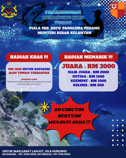 Jom beramai-ramai menyertai Pertandingan Memancing Ikan Toman Piala YAB. Dato' Panglima Perang Menteri Besar Kelantan yang akan berlangsung pada 13 Disember 2025 (Sabtu) bertempat di Taman Perlindungan Ekosistem Sultan Ismail Petra (TPESIP), Tasik Pergau, Jeli, Kelantan. Untuk makluman, Pertandingan Memancing Ikan Toman Piala YAB. Dato' Panglima Perang Menteri Besar Kelantan ini adalah penyertaan terhad oleh itu siapa cepat dia dapat. Yuran penyertaan adalah sebanyak RM 10.00 sahaja. Hadiah disediakan dari Johan sehingga tempat kelima. Hadiah bagi Juara adalah sebanyak RM 3000.00. Selain itu sebanyak 20 cabutan bertuah turut menanti anda.